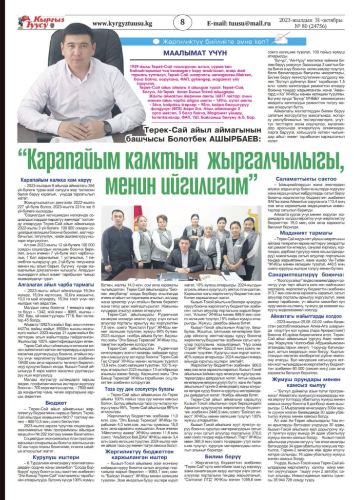Терек-Сай айыл өкмөтүнүн башчысы Ашырбаев Болотбек Сапарбекович Кыргыз Туусу гезитине маек берди.